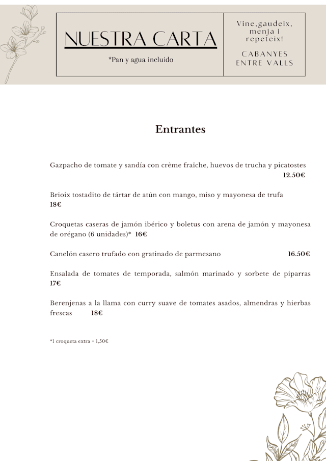 10/10Our lunch in Cabanyes Entre Valls was perfect. Lamb mille-feuille and goat main course were amazing same as duck!