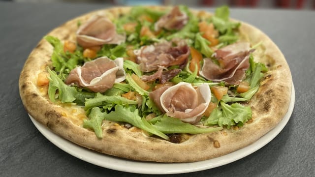 Prosc. crudo, valeriana. pomodorino, scaglie di grana, olio EVO (tutto al crudo)