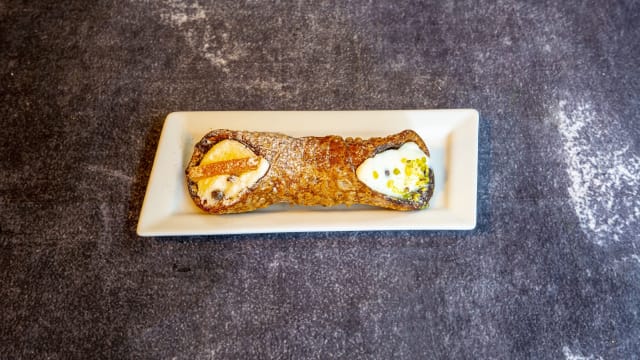 Canoli de masa crujientes rellenos de crema ricotta de oveja (queso ricotta, azúcar y trocitos de chocolate)