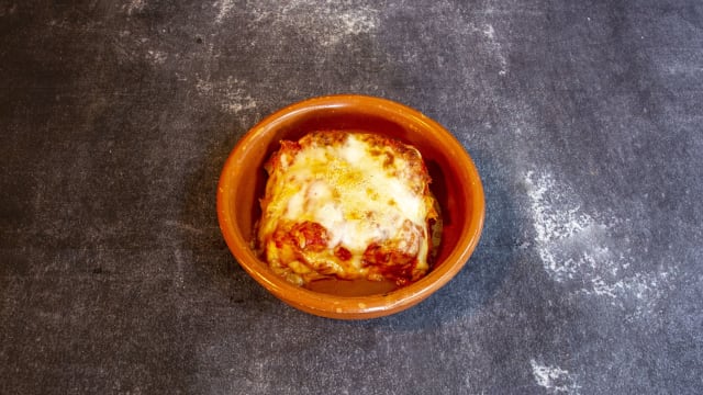 Pasta fresca con salsa de tomate, carne, mozzarella, queso parmesano