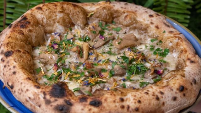 - Crema di broccoli “arriminati”, fiordilatte, pomodori secchi, salsiccia di suino, mollica tostata, uva passa, pinoli, fili di peperoncino bio, basilico fresco, olio evo.