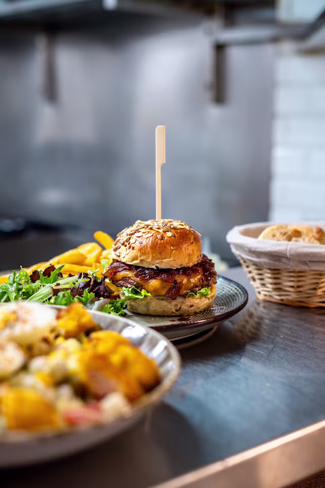 - 150g Steak, double cheddar, oignons caramélisés, salade iceberg, sauce burger, frites