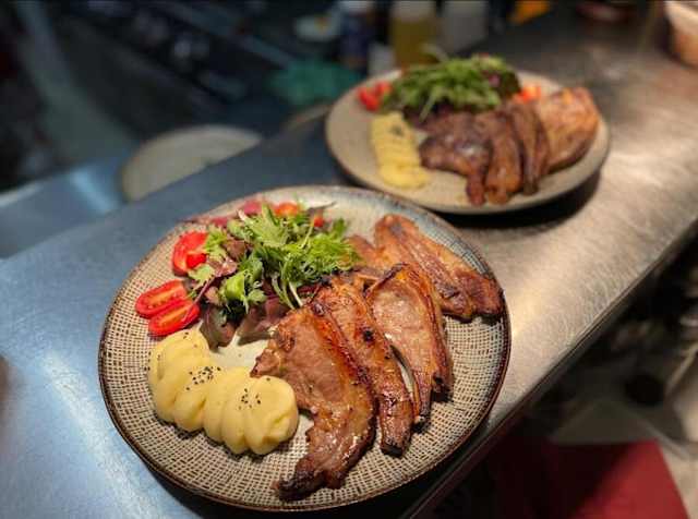 - Côte de boeuf du boucher (250g), frites ou purée de pommes de terre, salade mixte, sauce champignons