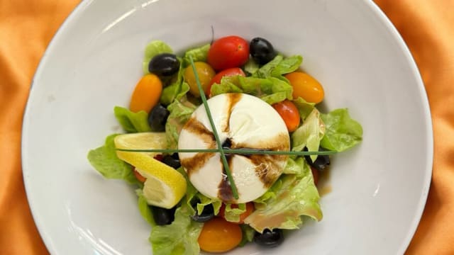 Salade, tomates, noix, toasts de chèvre chaud, vinaigrette, miel.