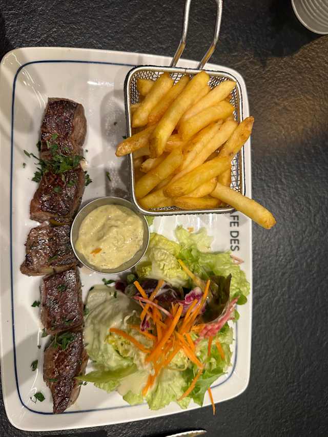 5/10super pricey for the quality of the food.. the 2 skinny sausages that arrived on the main plate of sausages looked like the cheapest sausages you can get at the supermarket. the steak was actually ok in terms of texture, there was just no flavor to it. the prices you are paying are for the location and nothing else, you can spend your 25 euros much better somewhere else.