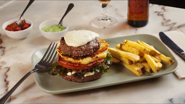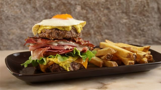 Carne misturada com alheira de caça, molho de mostarda antiga, bacon, tomate, alface, cebola frita e ovo estrelado