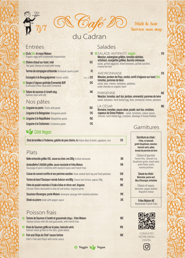 10/10We booked a last minute reservation to have dinner at Cafe du Cadran, and we were very happy. The server was kind and attentive. The ambiance was relaxing and comfortable. The food was one of the best meals we had in Paris. Perfectly seasoned and cooked steak, crispy fries, and fresh mixed green salad. The pepper sauce for the steak was so good. Linguine bolognese was flavorful. Onion soup was pleasantly rich with a lot of onions and so much flavor. Our family (2 kids 2 adults) were very happy with our meal and the restaurant as a whole. We really appreciate how the man and woman who worked there were so accommodating to our family. Thank you!