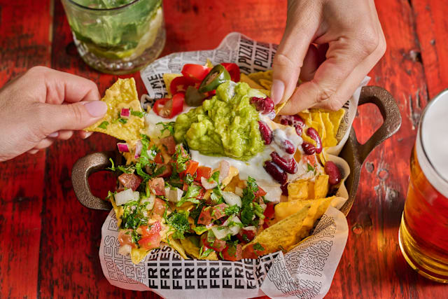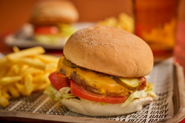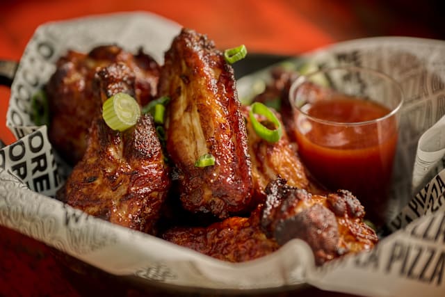 Pizza cuite sur pierre avec une base de sauce tomate fraîche, garnie de fromage mozzarella, de bœuf pimenté, d’olives noires, oignons rouges, de jalapenos et d’huile d’olive.