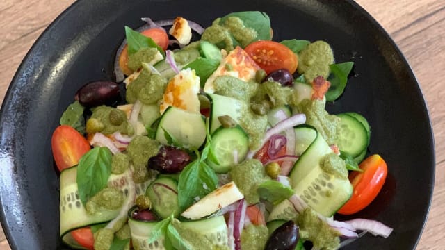 con queso feta, olivas kalamata, pistachos, vinagreta de agave y lima