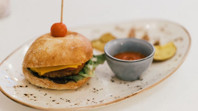 con queso Chedar, lechuga, tomate y salsa barbacoa. Acompañada de chips de boniato.
