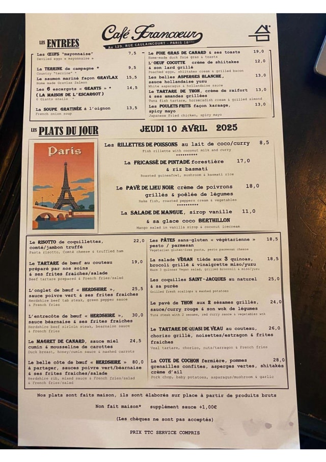 9/10Quaint bistro on the far side of Sacre Coeur. The waiter is very friendly and accommodating. The salads were good. The burger was fine and the duck breast could have been a little more succulent; however, it was still good for the price. Not fine dining but very good overall. I’d stay for an afternoon here.