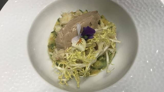 Salade de mesclun, gésiers, magret de canard fumé, maïs, asperges blanches, et son toast de foie gras maison