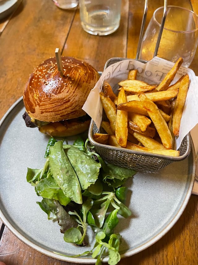 Burger au Cantal ou Cheddar, oignons confits, sauce cocktail, frites, mesclun