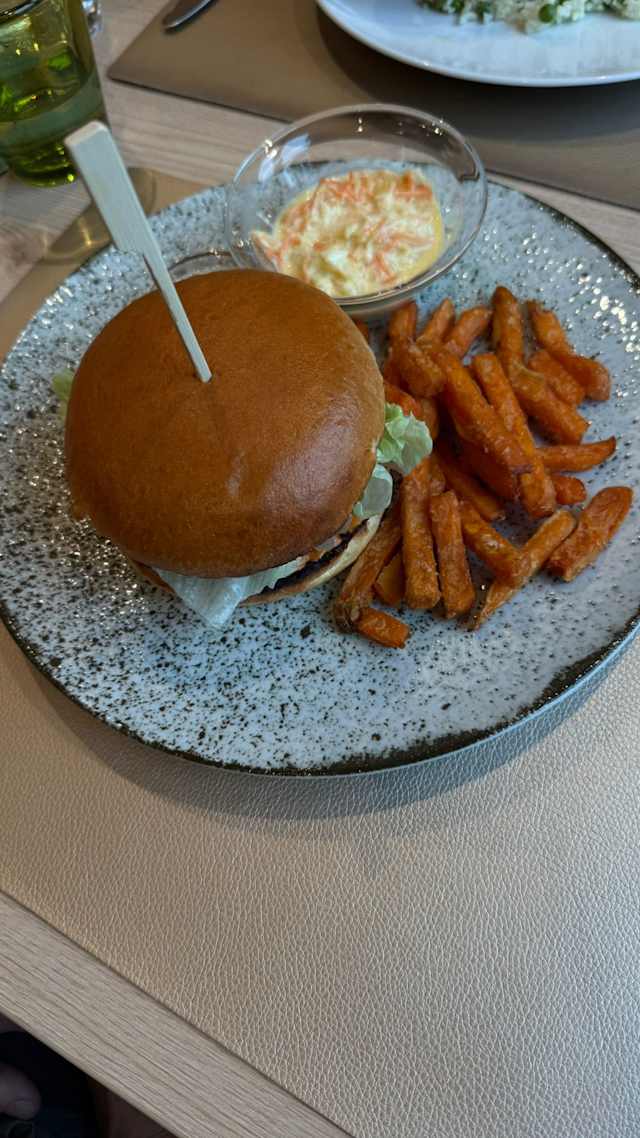 - Brioche bun i rindfleisch oder vegi pattie | rauchpaprika – Mayo | karamellisierte zwiebeln i greyerzer | tomaten Gurkenchutney Coleslaw salat | süsskartoffel pommes-frites