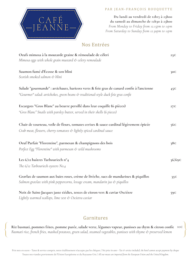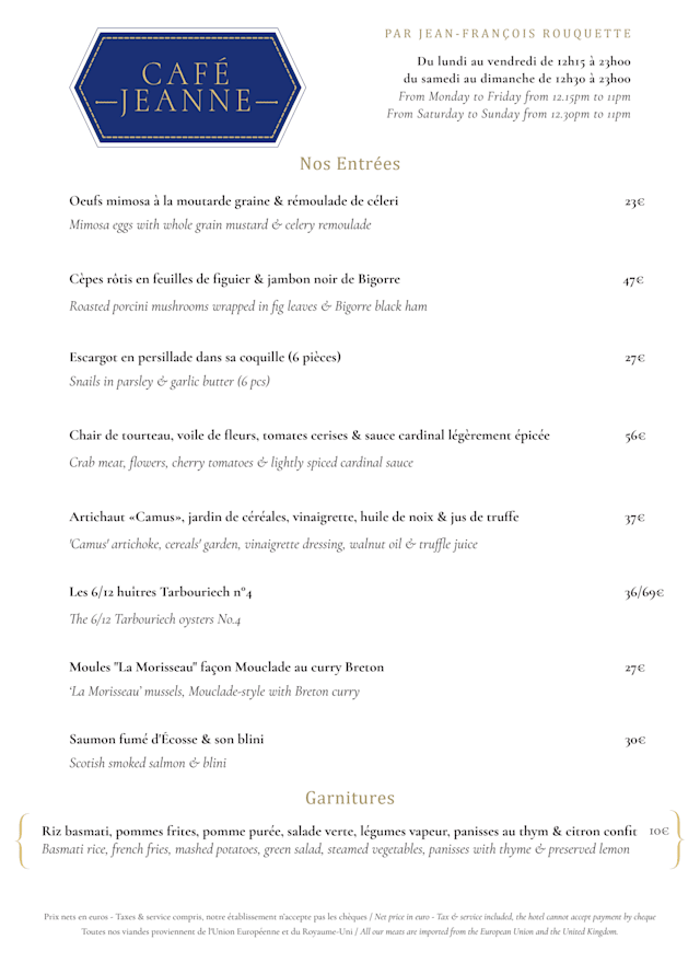 Dear Arnold, We would sincerely like to thank you for taking the time to publish your review following your experience at Café Jeanne. We are so delighed to read that you really enjoyed the cuisine of Chef Jean-François Rouquette, the quality of the service and our wine menu. We look forward to welcoming you back very soon. Best regards, Artur Cwynar Food & Beverage Manager