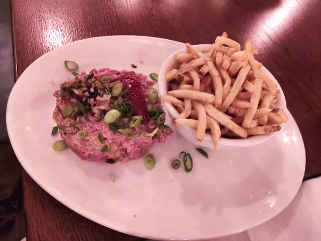 - Le tartare de bœuf préparé & pommes allumettes
