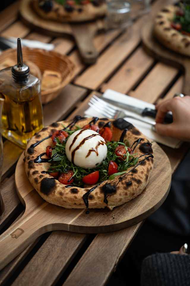 - Tomates/basilic/mozzarella fior di latte/champignons/bresaola/roquette/burrata des pouilles