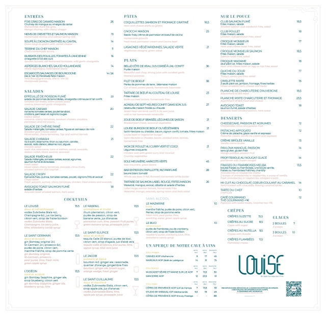 10/10Cafe Louise was recommended to us by our hotel. Our request was local, French, smart but relaxed. It didn’t disappoint. The nems to start with and crepe suzette for dessert were delicious and enough to share, and our mains were v tasty. Nice decor and atmosphere. Would definitely recommend if you’re looking for a St Germain restaurant/brasserie.