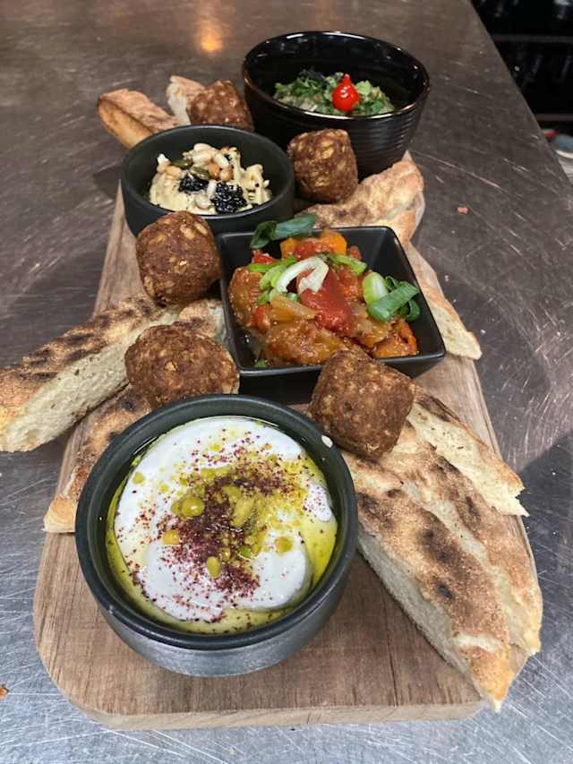 - Fallafel, houmous, caviar d'aubergine, chakchouka, labneh, pain à tajine