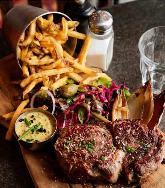 - Échalote, câpre, cornichon, ketchup, moutarde, persil, frites maison