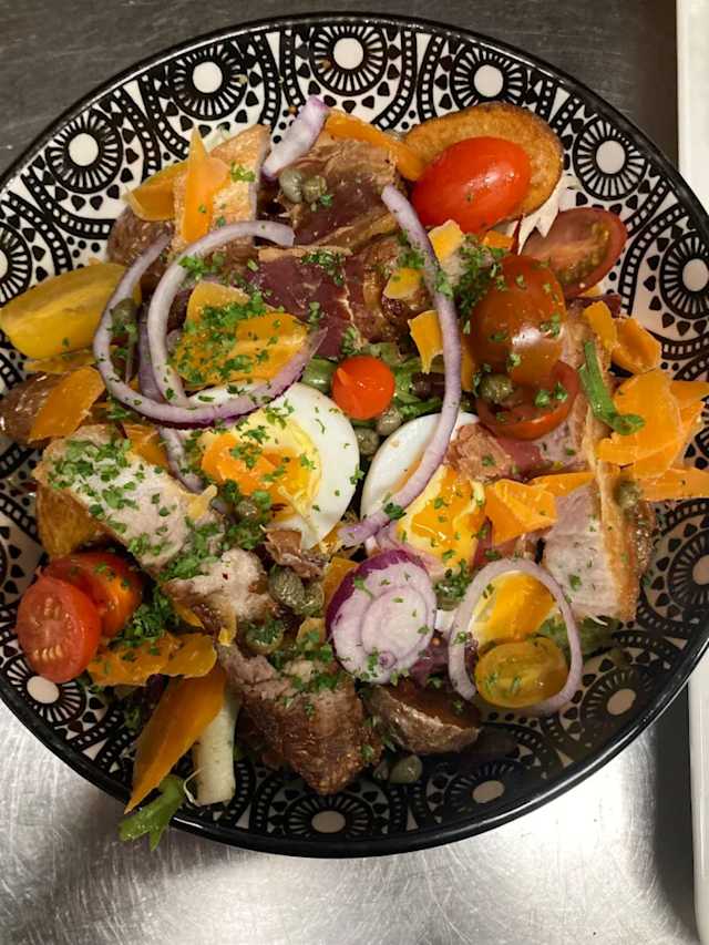 - Gros lardons fumés, grenaille, œuf mollet, vieille mimolette, fleur de câpre, tomate cerise, mesclun