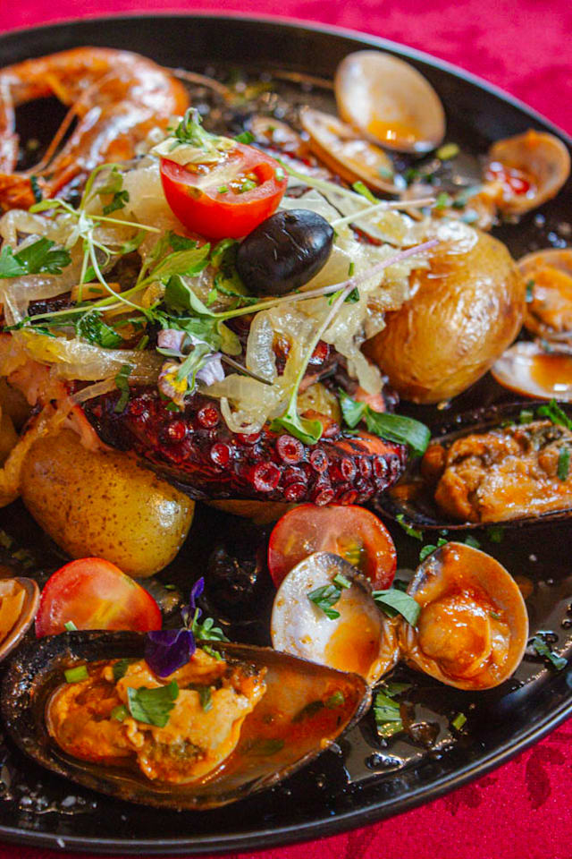 Carne de porco, amêijoas, batata frita, tomate cereja e cebolinho