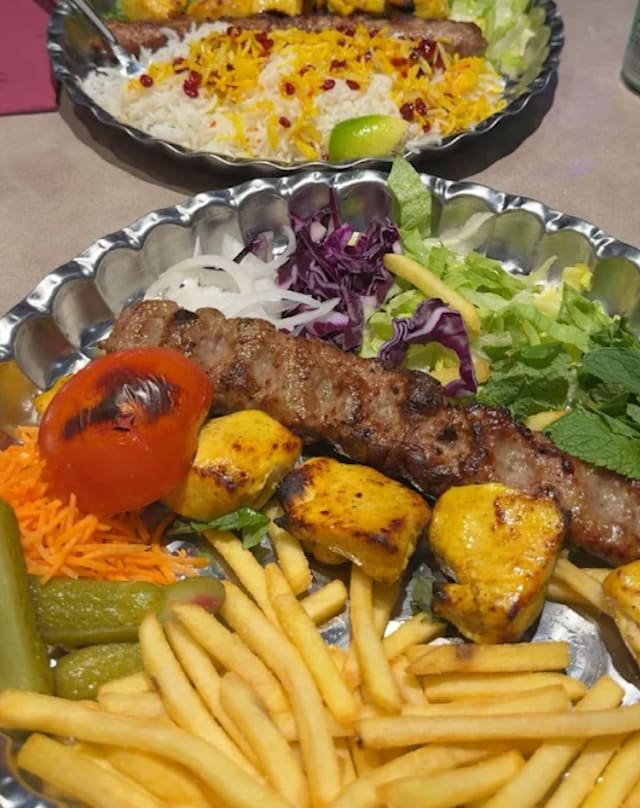 - Viandes de veau et d'agneau finement hachées, marinées aux épices, grillées au feu de bois, servies avec riz persan au safran et tomates confites.