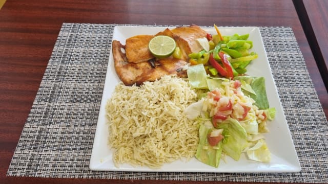 - Crevettes, sauce maison, les légumes de saison, riz basmati.