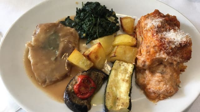 Piatto misto con Lasagna e Saltimbocca alla romana con patate e verdure