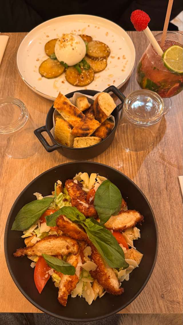 - Chèvre chaud pané, mesclun, tomates cerises, tomates confites, oignons rouges, fruits rouges, pignons, persil