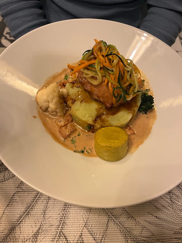 10/10We appreciated that there was a vegan offering for the main dish. It would have been nice to have a vegan entree and dessert as well. The service was great, seating was comfortable and the dining room cozy. The food was delicious. The patio seating is on a very nice square.