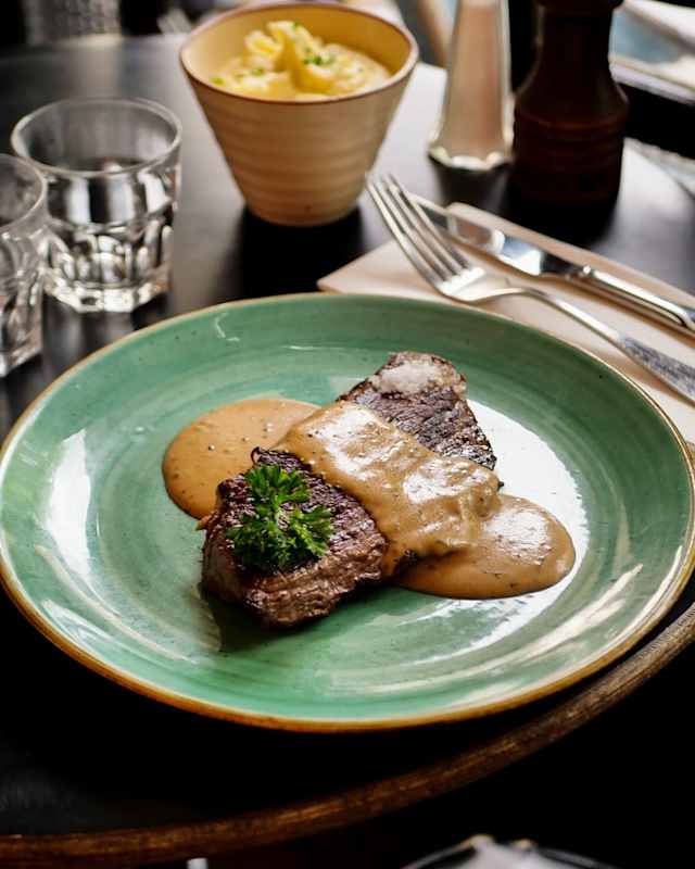 - L’entrecôte de bœuf, sauce au poivre, frites & salade (~250g)
