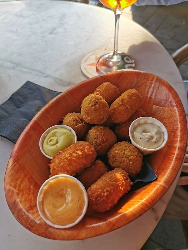 9/10Lovely restaurant close to the harbour. We sat inside as it was cold and rainy and it was lovely, very dark and cosy. We had some great wine and beers with our deep fried combination platter. A good way to try some of the local cuisine.