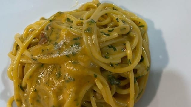 Spaghetti al nero di seppia con colata di ricotta fresca