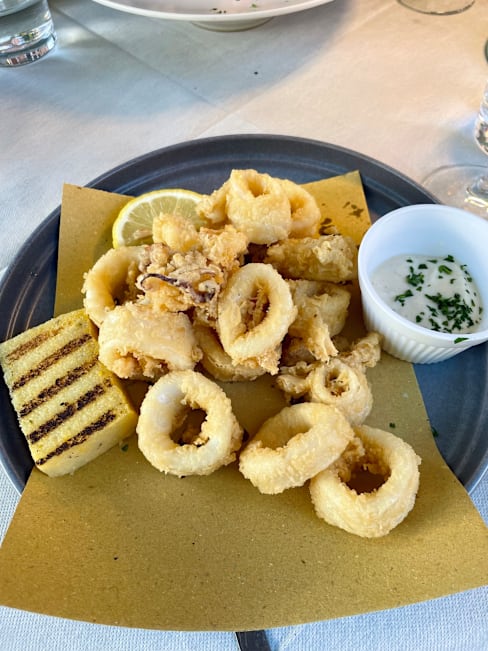 7.5/10The portions are generous, especially the fried calamari and the grilled fish, prawns, etc., which is normal given the high price level in very simple place. The squid ink pasta lacks taste (garlic, pepper, etc.). In terms of atmosphere, there is none, but that doesn't matter: it's just a large terrace in front of a building exposed to the heat and without the slightest breath of wind. If you are with family or a group, it's fine, and you will create the atmosphere. If you want Venetian romance, no.
