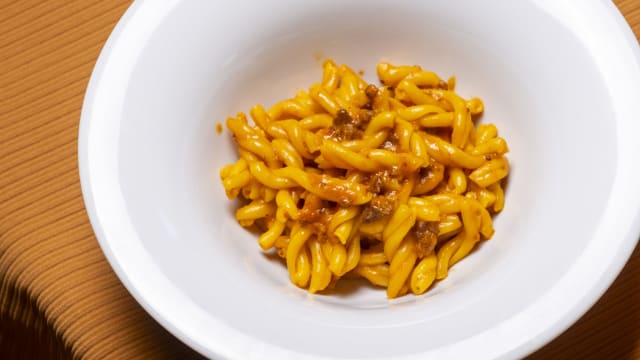 Rigatone del “torquatone” con pomodoro, pancetta, cipolla e peperoncino