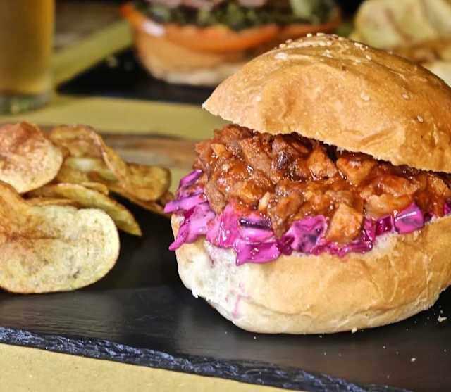 - Pulled pork aromatizzato barbecue e salsa coleslaw, accompagnato da chips artigianali. Accompagnato da chips artigianali