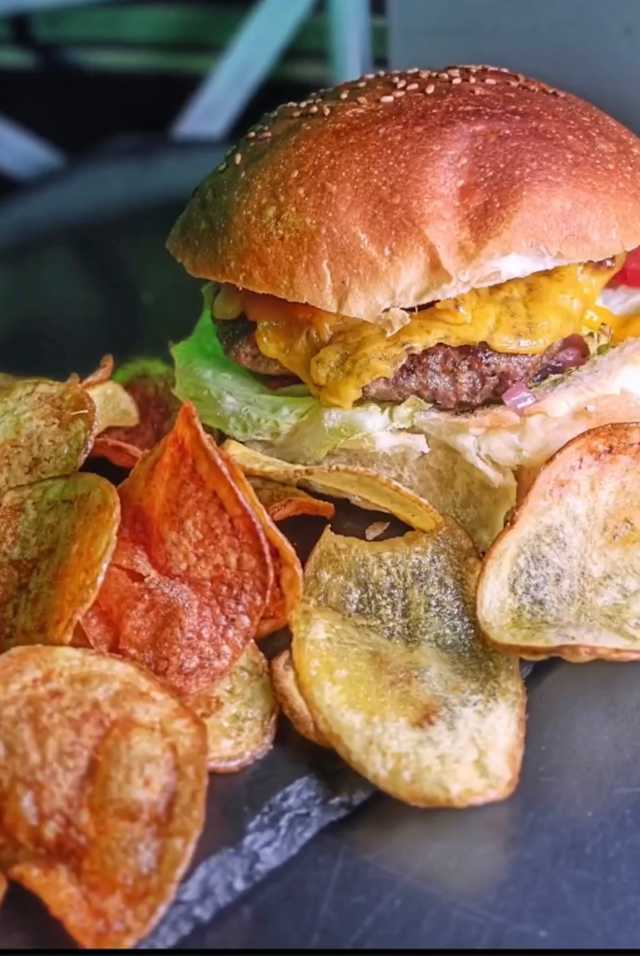 - Hamburger di manzo 150g, bacon, cheddar, pomodoro, insalata e cipolla caramellata, accompagnato da chips artigianali. Accompagnato da chips artigianali