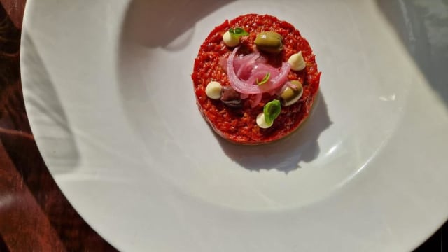 Tartare di manzo, pesto di pomodori secchi, cipolla agrodolce e olive