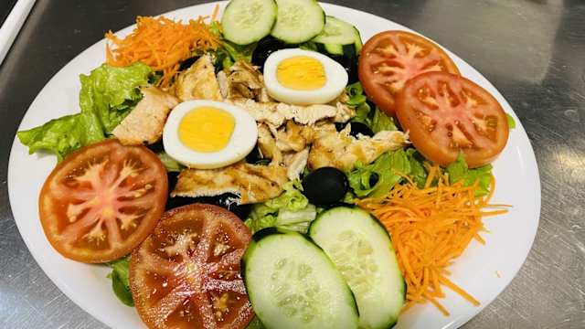 - Frango, alface, tomate, cenoura, azeitonas e ovo cozido