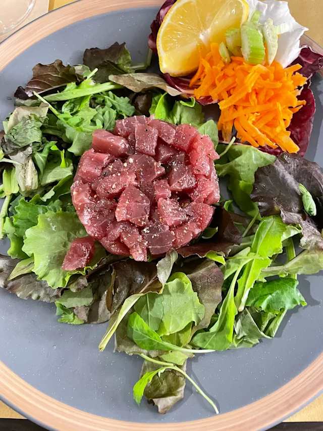 - Tartare tonno, stracciatella, basilico, capperi, granella di pistacchio, olio EVO, pepe nero