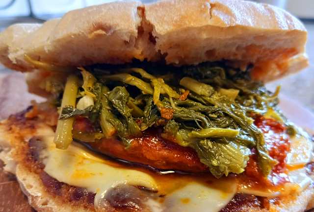 - Ciabatta casereccia calabrese con salsiccia dolce di suino nero di calabria, provola affumicata, peperoni a filetti sott'olio, patate rustiche calabresi e glassa al bergamotto.