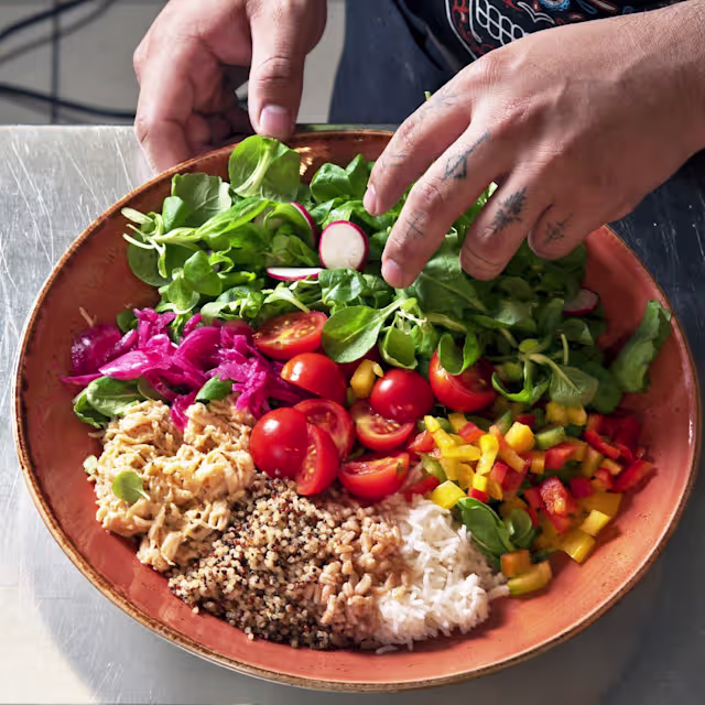 - Bowl con straccetti di pollo e riso, bacon croccante, avocado, insalata, pico de gallo, coleslaw e salsa ranch.