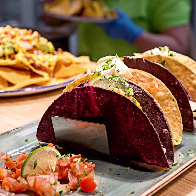 - Green tortilla con straccetti di manzo marinati alla messicana, formaggio filante, fagioli, crunchy nachos, mix di verdure, riso e salsa sweet BBQ.