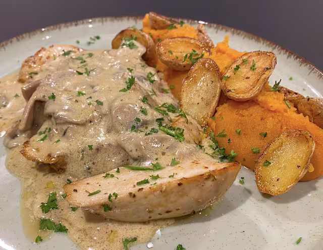 - Pavé de saumon, purée de carottes au sésame et orange legumes de saison