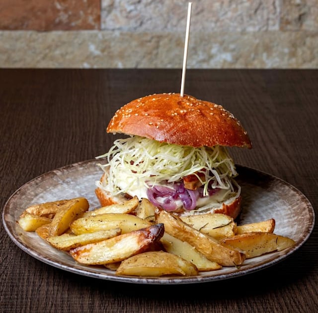 Burger di manzo cipolla saltata provola, guacamole piccantina crema di melanzane affumicate, iceberg, pancetta croccante