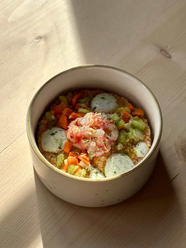 - Cous cous,gambero rosso, dadolata di verdure, tzaziki
