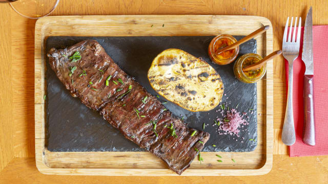 Corte tierno y sabroso que proviene de la parte del diafragma del animal. Conocido por su textura y su sabor intenso con un toque ahumado.