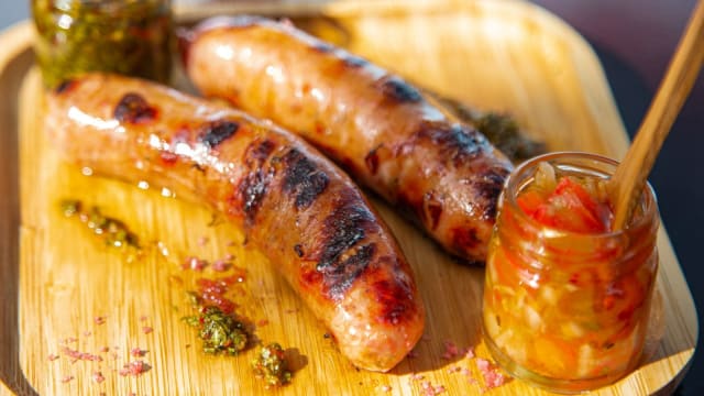 Sandwich de embutido de carne vacuna y cerdo condimentado con ajo, pimentón y comino, de sabor intenso y picante, con lechuga, tomate, chimichurri y mayonesa.