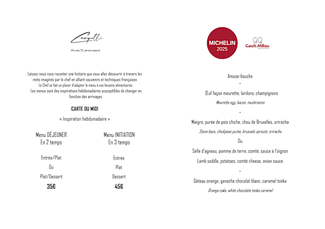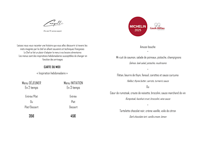 Dear Benjamin, Thank you so much for your wonderful words! 🌸 We’re delighted to hear that you consider your experience with us the highlight of your meals in Paris. Knowing that both the presentation and taste left such an impression truly means a lot to our team. We’ll be more than happy to welcome you back with new creations on your next visit to Paris! ✨ Warm regards, The Campelli Team